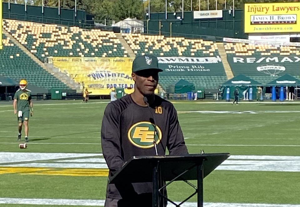Edmonton Elks linebacker Derrick Moncrief speaks with Dave Campbell after practice with his new team