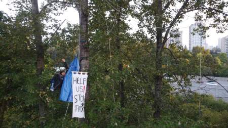 Demonstrators have maintained tree-sits in the area for about two weeks in an effort to stop logging linked to construction of the embattled oilsands expansion project.