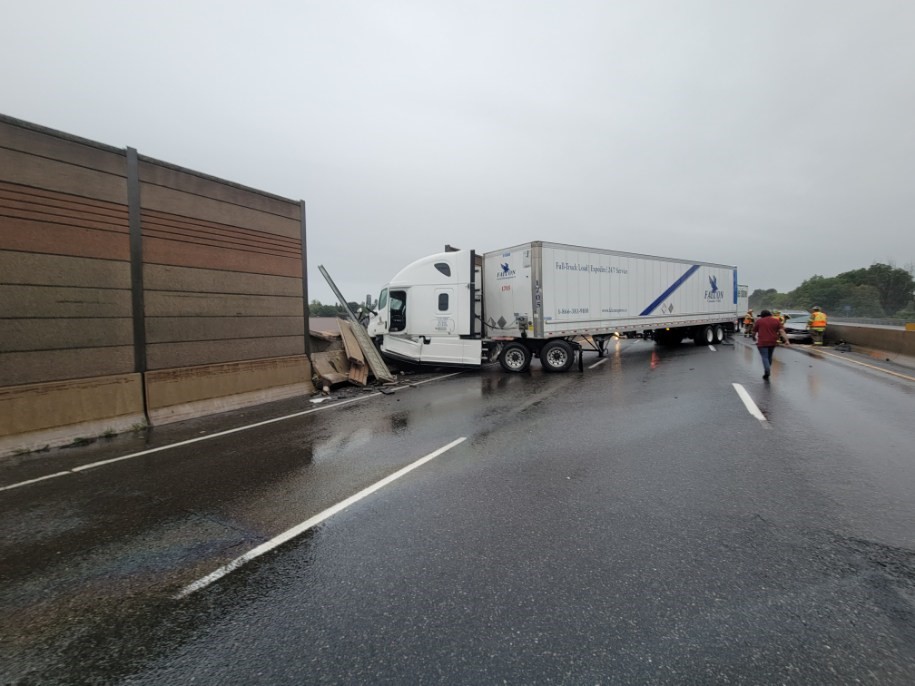 Then while at the scene there was a seven-vehicle collision just west of the Ganarasksa River overpass which included a transport truck crashing through a concrete barrier.