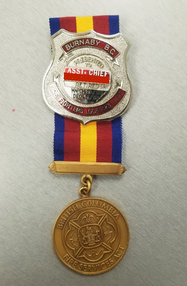 The medal had been presented to a former Burnaby assistant chief and appears to commemorate a 35-year career that began in 1950.