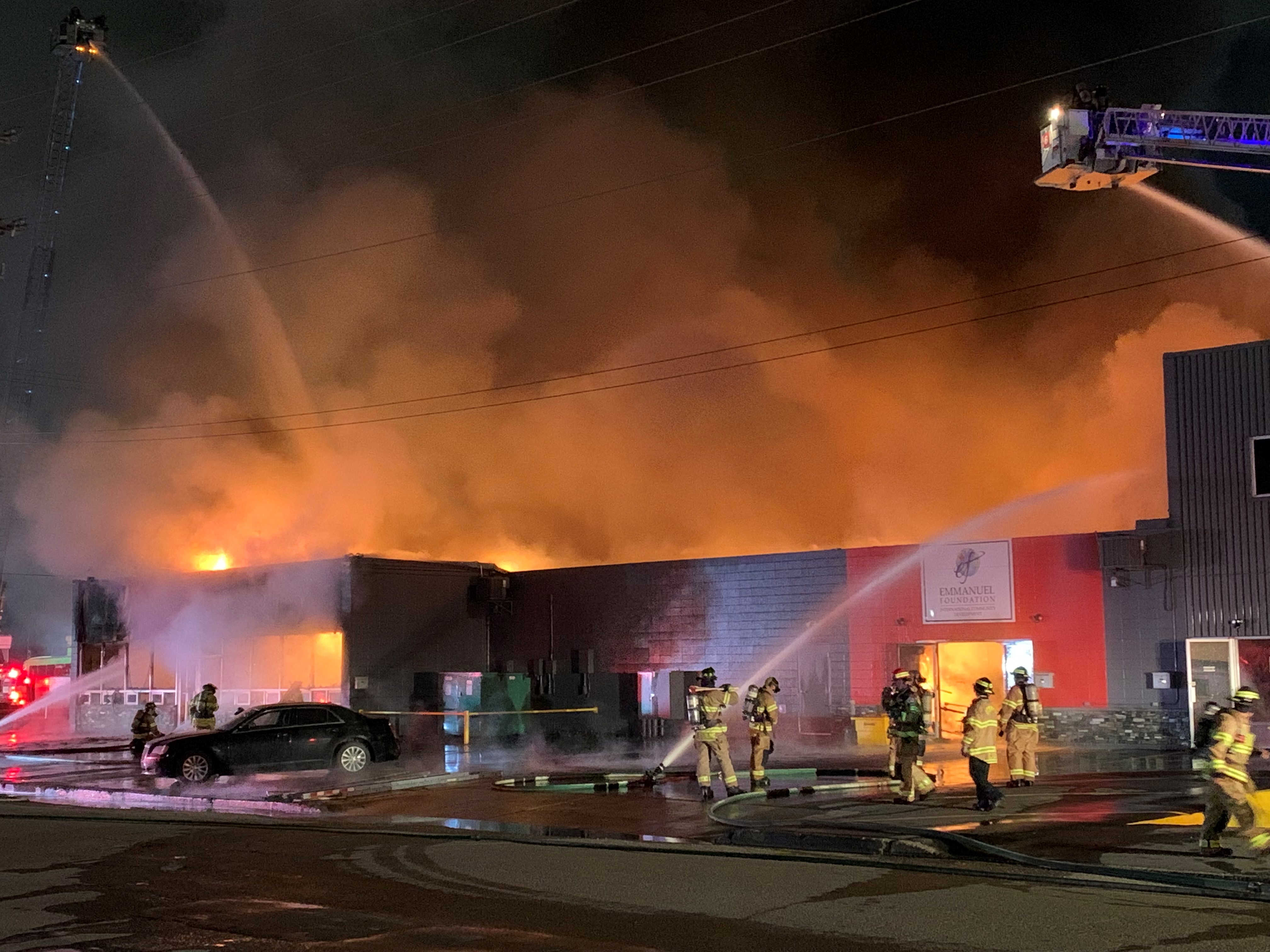 Several bays of a commercial building in an industrial area on the east side of Edmonton were consumed by fire early Friday, gutting a charity and its thrift store.