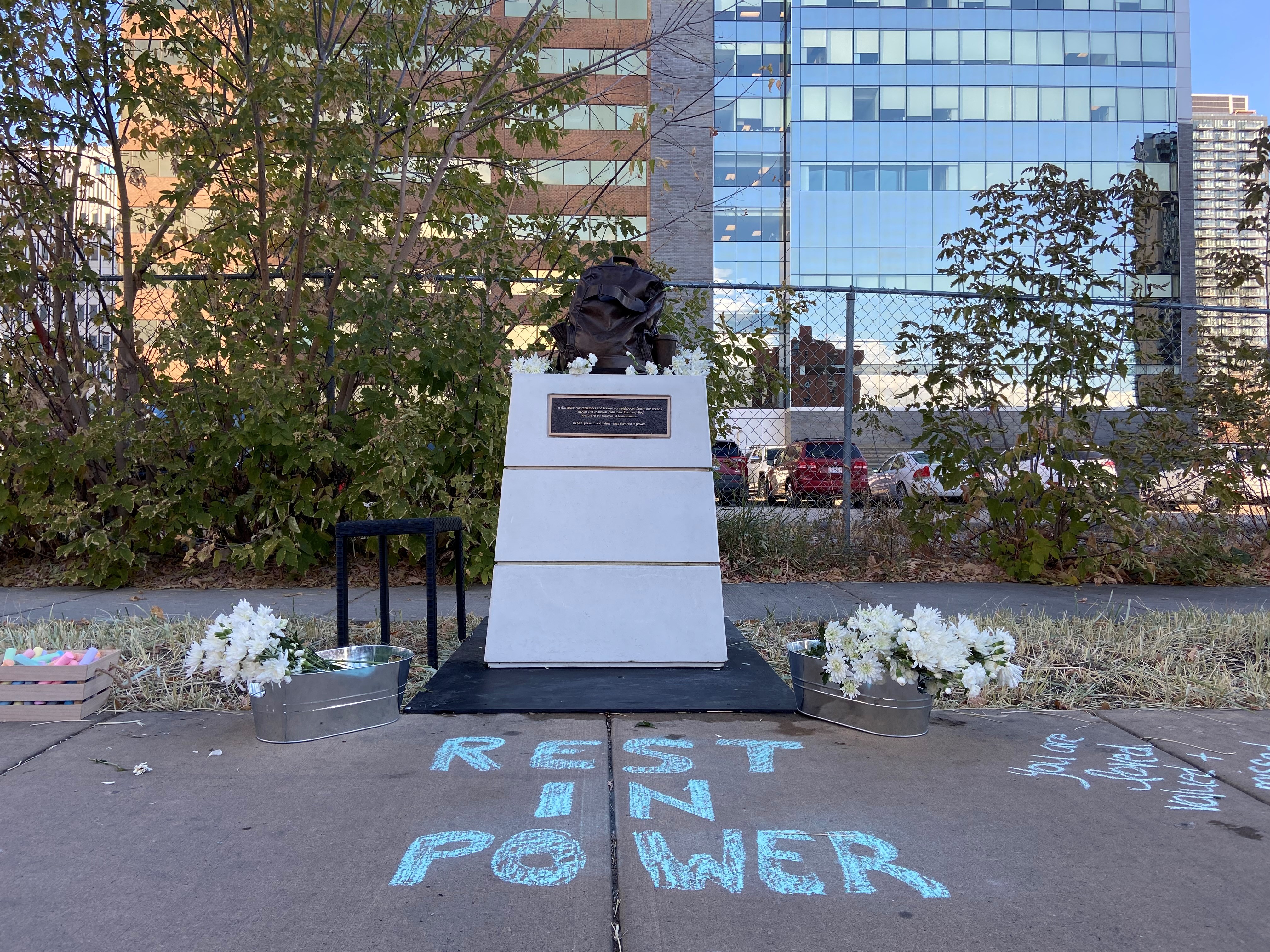 One monument is a sculpture of a backpack, a replica from someone who survived in homelessness for over a decade.