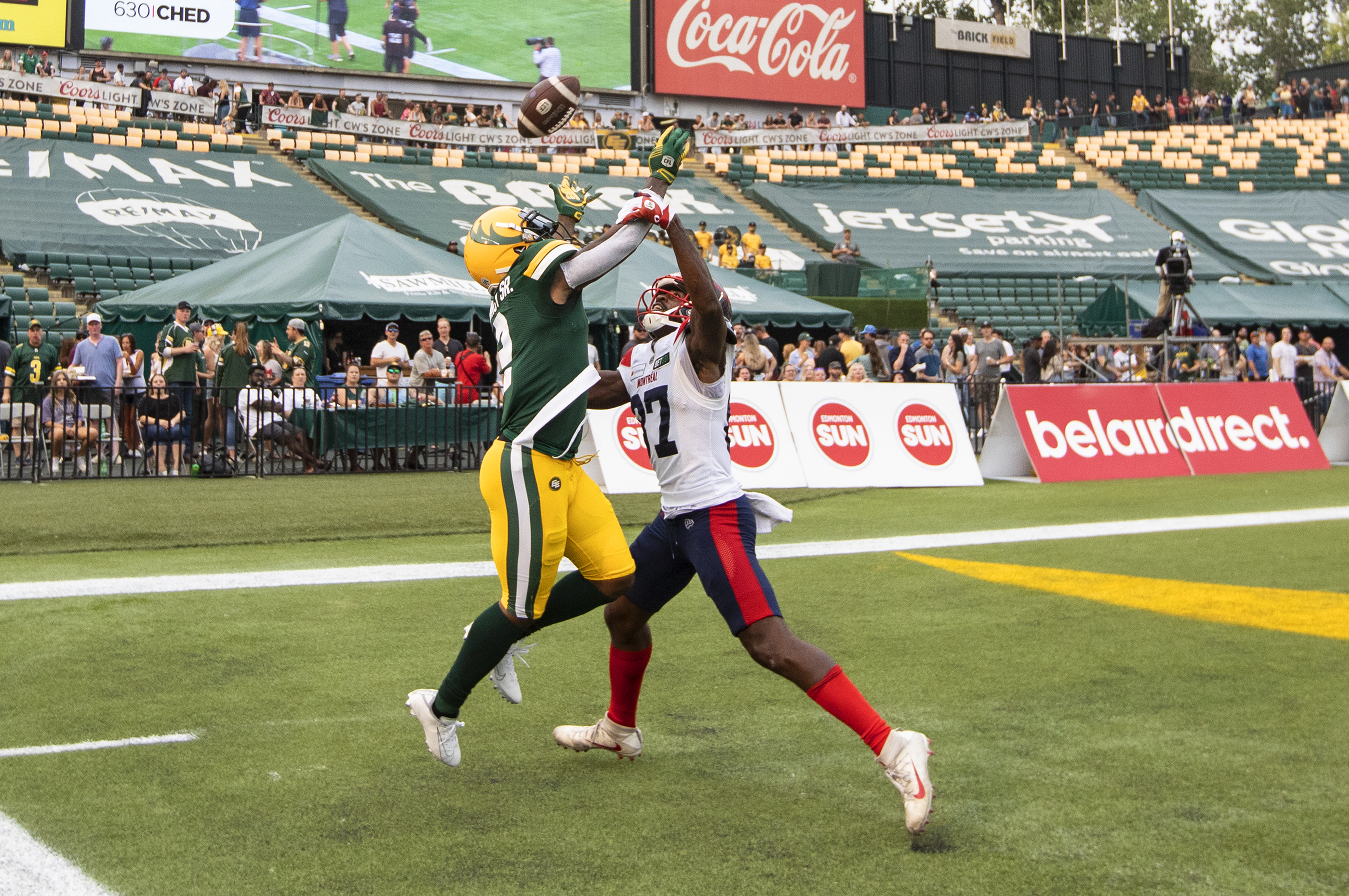 Edmonton Elks defensive back Aaron Grymes laments his missed interception against the Bombers in a 26-16 loss