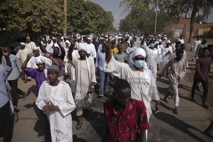 Protesters carried Sudanese flags and chanted “Military rule can’t be praised” and “This country is ours, and our government is civilian” as they marched in neighborhoods across Khartoum.