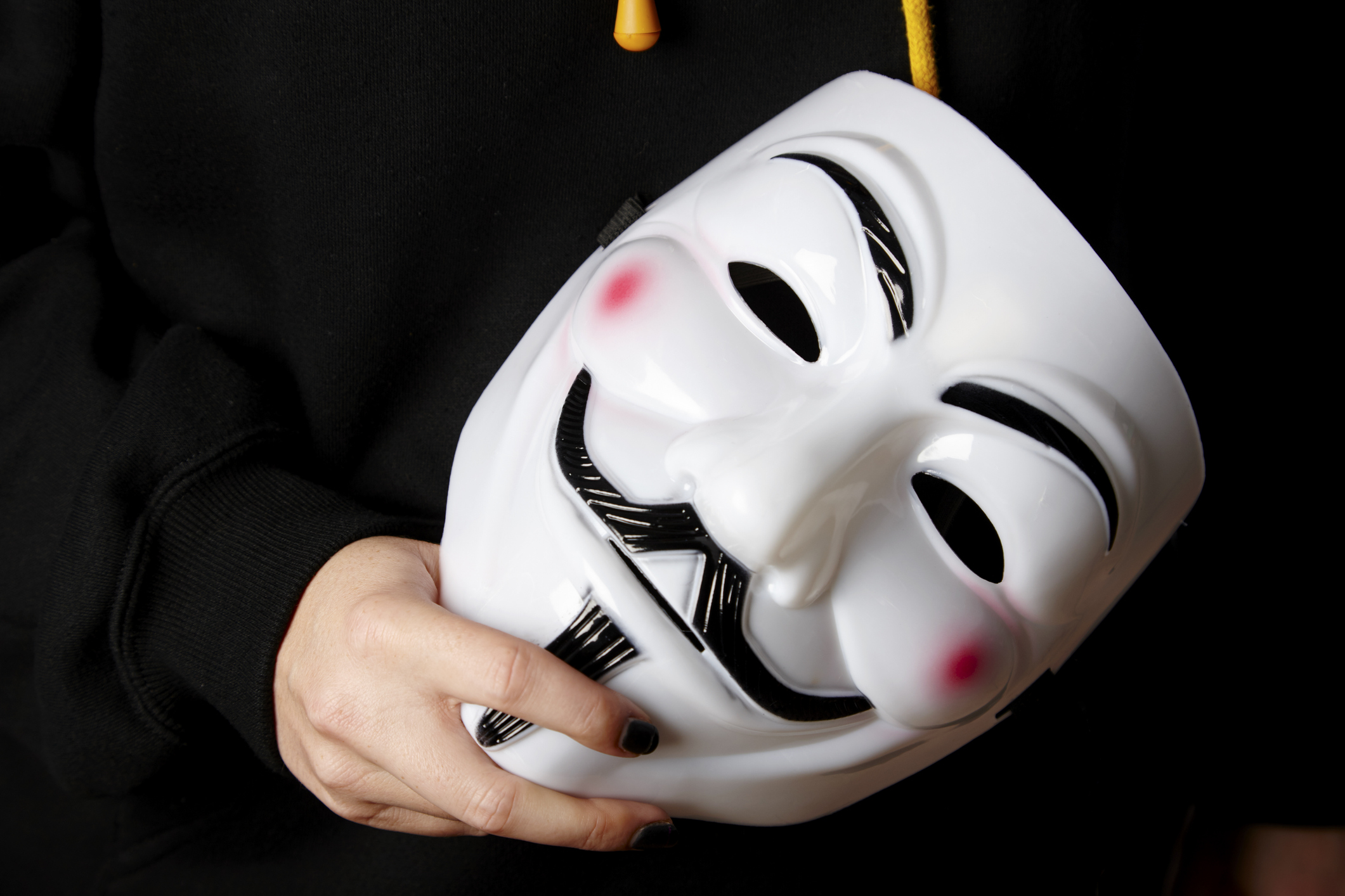 Police said he was wearing a black hoodie, black pants, black shoes with white soles and a Guy Fawkes mask. He was also carrying a white bag.