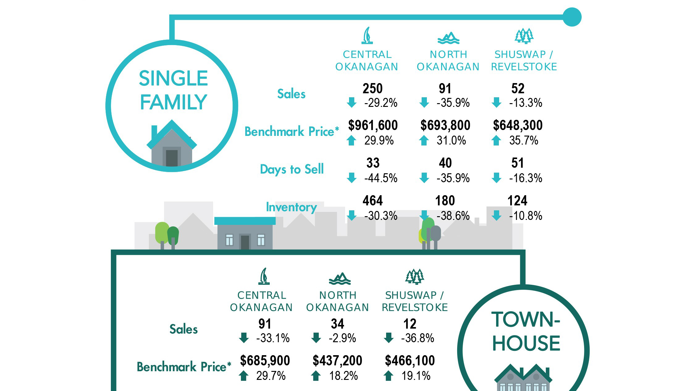 According to the association, the benchmark price for homes in the Central Okanagan, North Okanagan, South Okanagan and Shuswap/Revelstoke regions continue to show double-digit percentage increases in year-over-year comparisons in all home categories.
