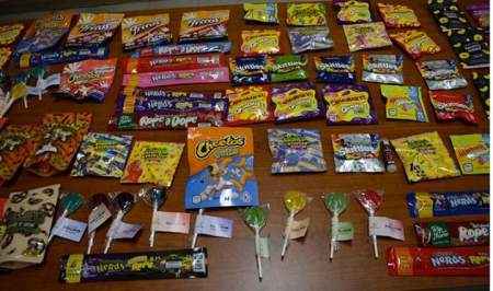 A photograph released by investigators showed some of the packages that were seized. Cheetos packages, Skittles bags and lollipops are among the many products that these cannabis products appear to look like.