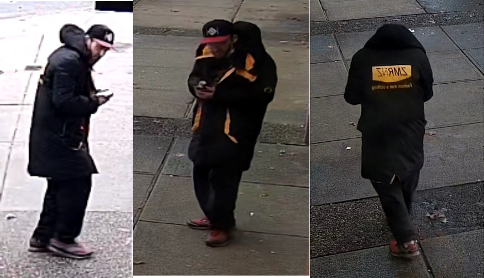 He is described as a man 25 to 35 years old, who was wearing a black three-quarters length winter coat with yellow trim and a black-and-yellow logo on the back, black pants, brown shoes and a black hat with a red brim.