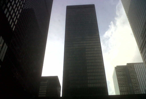 Toronto police tell Global News that wood debris from construction at First Canada Place was blown across the street and smashed three large glass windows on the 27th floor of the Royal Trust Tower.