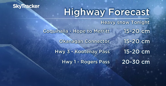 In the Southern Interior, heavy snow is expected starting Saturday night along stretches of highways at higher elevations.