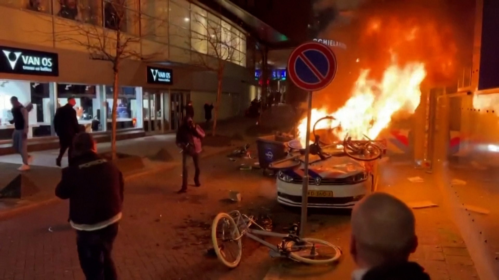Crowds of rioters in the port city of Rotterdam torched cars and threw rocks at police who responded with shots and water canon, as protests against COVID-19 measures turned violent on Friday night.