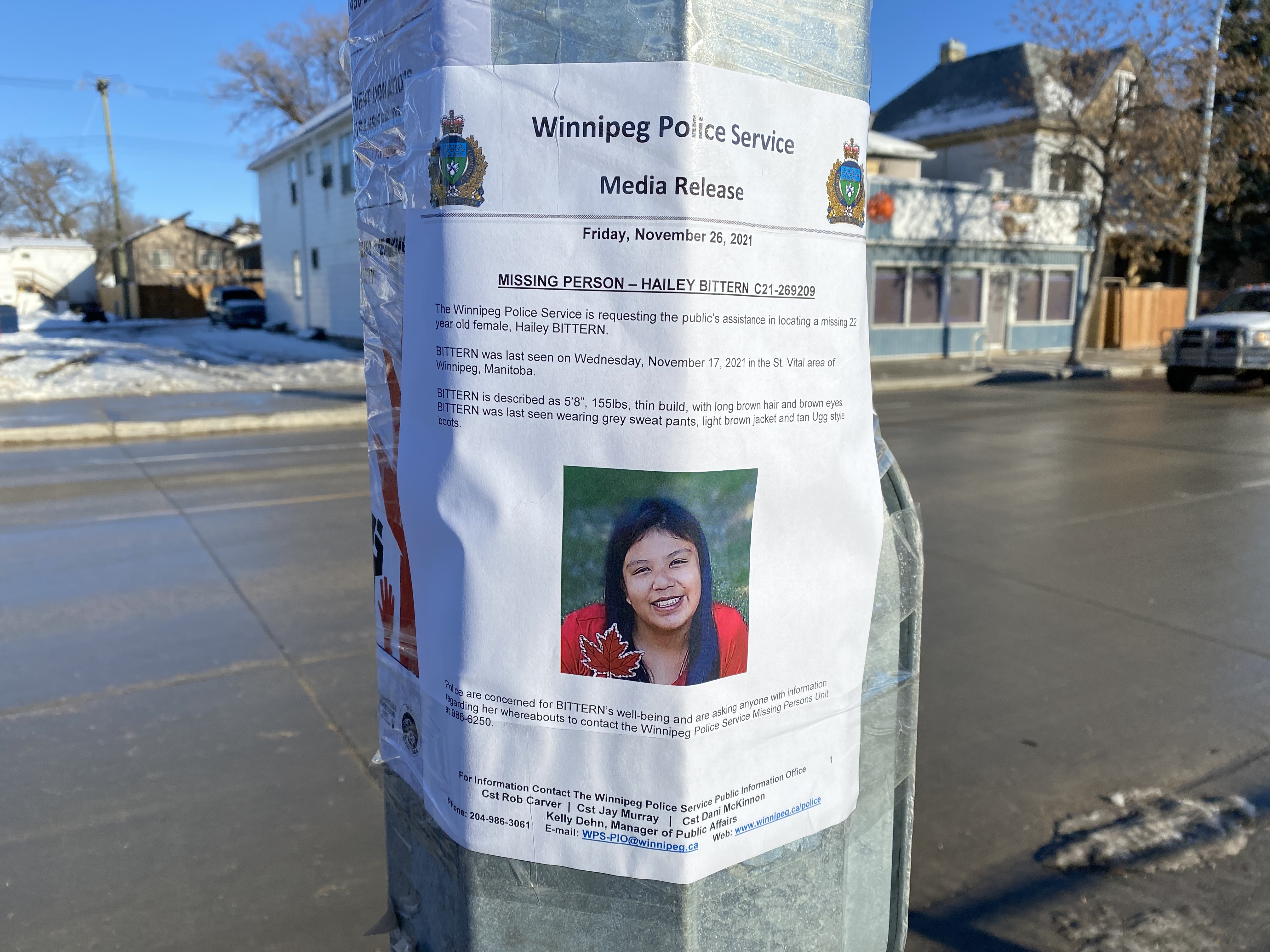 Winnipeg’s Bear Clan hit the streets on Saturday searching for Hailey Bittern was last seen on Nov. 17 in the St. Vital area, according to police.