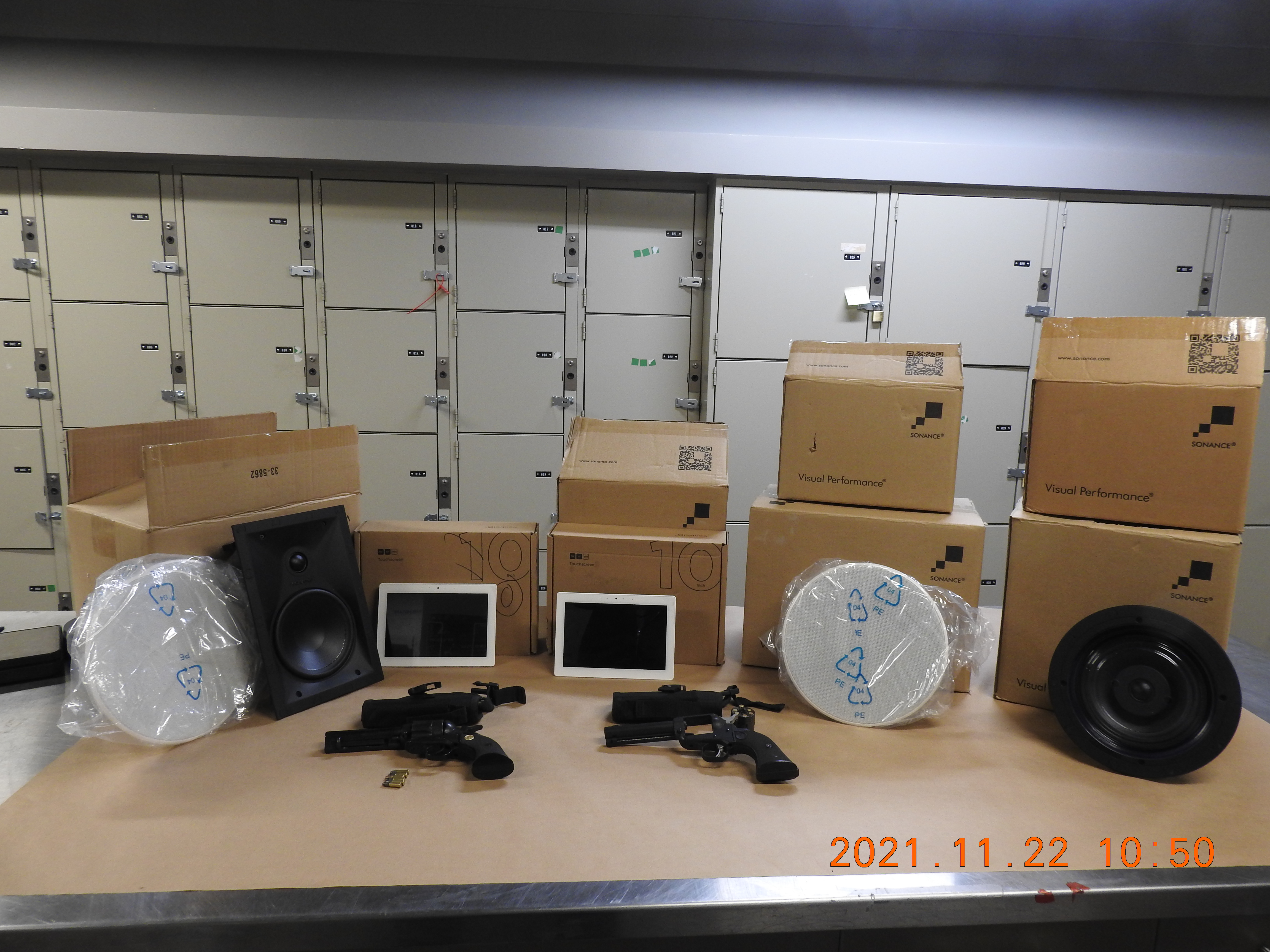Two weeks after it was reported stolen, thousands of dollars of audio equipment was recovered by the Kelowna Mounties, along with a couple of handguns.