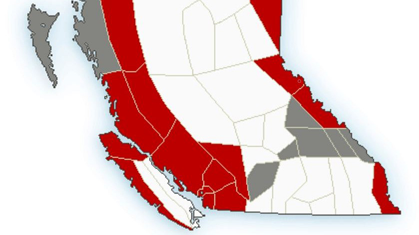 A map showing weather warnings in red and special weather statements in grey for B.C., on Tuesday, Nov. 30, 2021. A frontal system is expected to produce 40-50 mm of rain along the Coquihalla, and 30-70 mm from Eagle Pass to Rogers Pass on the Trans-Canada. Environment Canada