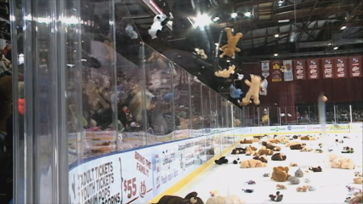 Fans are asked to put donations in individual, clear plastic bags, in order to keep the bears and toques clean when they hit the ice.