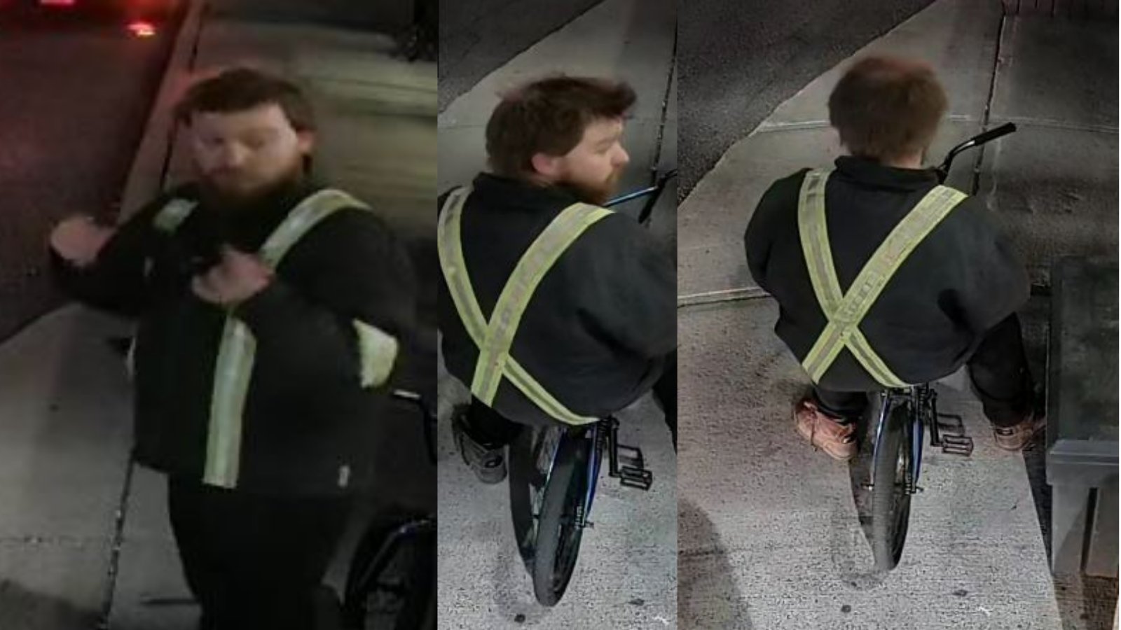 Police have released photos of one of the suspects, a man in his mid-to-late 20s, roughly six feet, two inches tall with a heavy build and dirty-blonde hair and beard. He was wearing a safety vest at the time with black pants and brown construction boots and rode off on a dark-blue BMX-style bike.