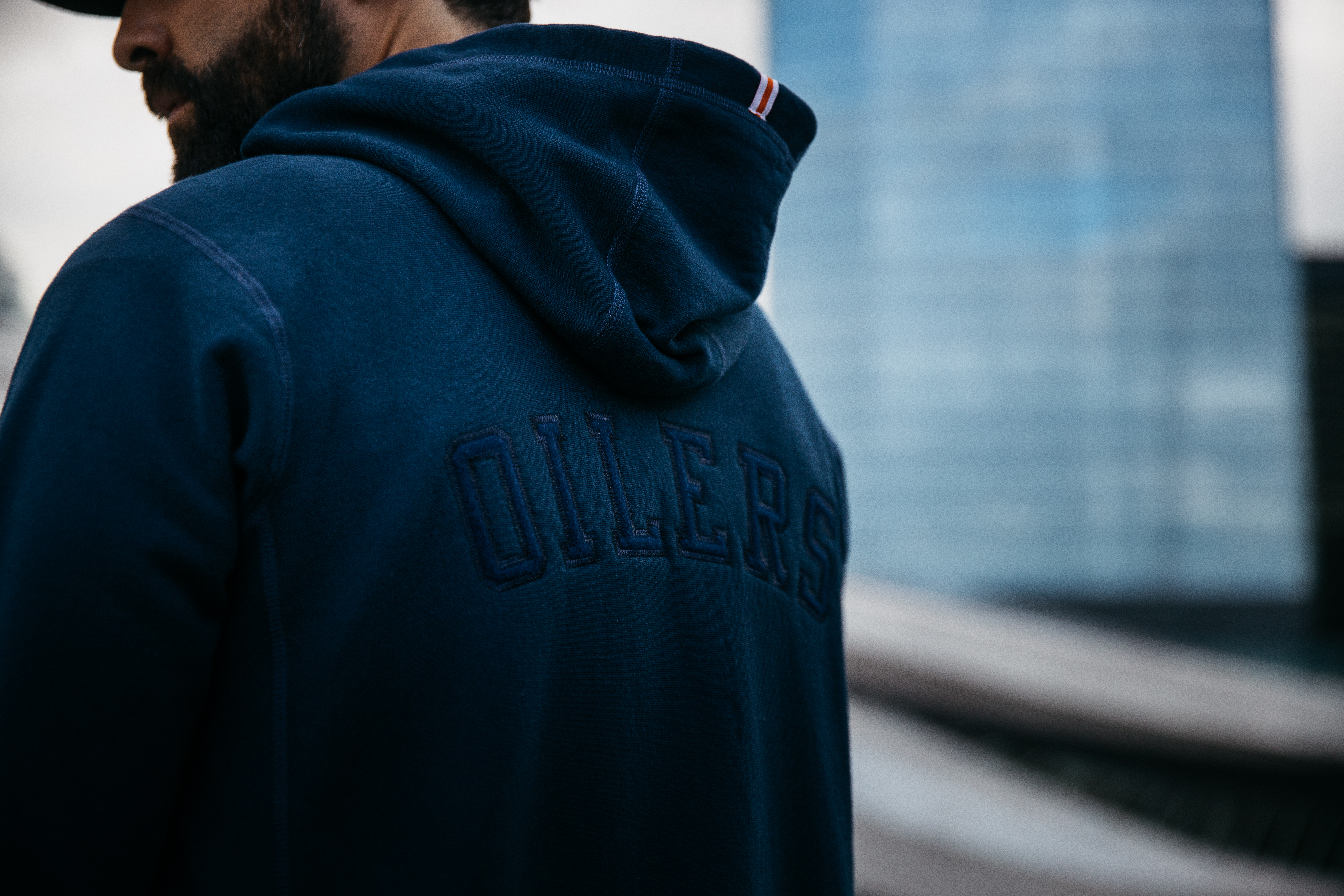 The line of clothing includes hoodies, crewneck sweaters, t-shirts, as well as hats and jackets. But instead of the traditional orange and blue Oilers colours, the merchandise is nearly all black with only the smallest hint of team colours.