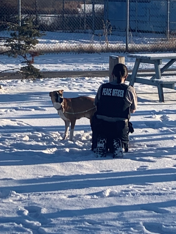 Just before 3 p.m., a short-haired Boxer cross was left in the snow, tied to a wooden pole on the grounds of the Calgary Human Society, the agency said in a media release Tuesday morning.