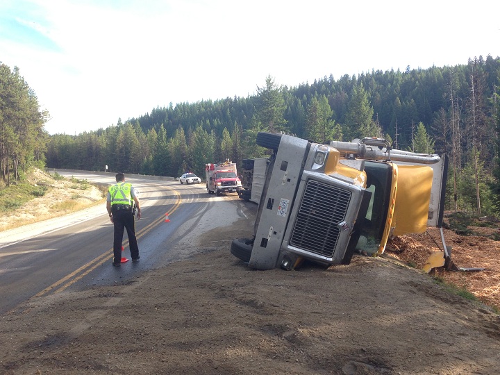 The incident happened at at round 8 a.m. about 10 kilometres south of Big White Road. Police say the southbound semi was loaded with wood chips and failed to negotiate a sharp curve.