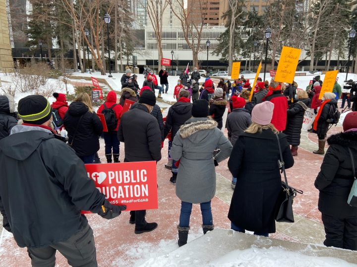 Members of Support our Students and the Alberta Teachers Association spoke at a rally at the McDougall Centre on Saturday. The rally was organized by local parents including Calgary mom Krista Li.
