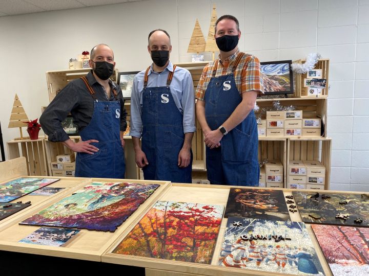 The men are working together at StumpCraft, a Calgary company that creates laser-cut wooden puzzles.