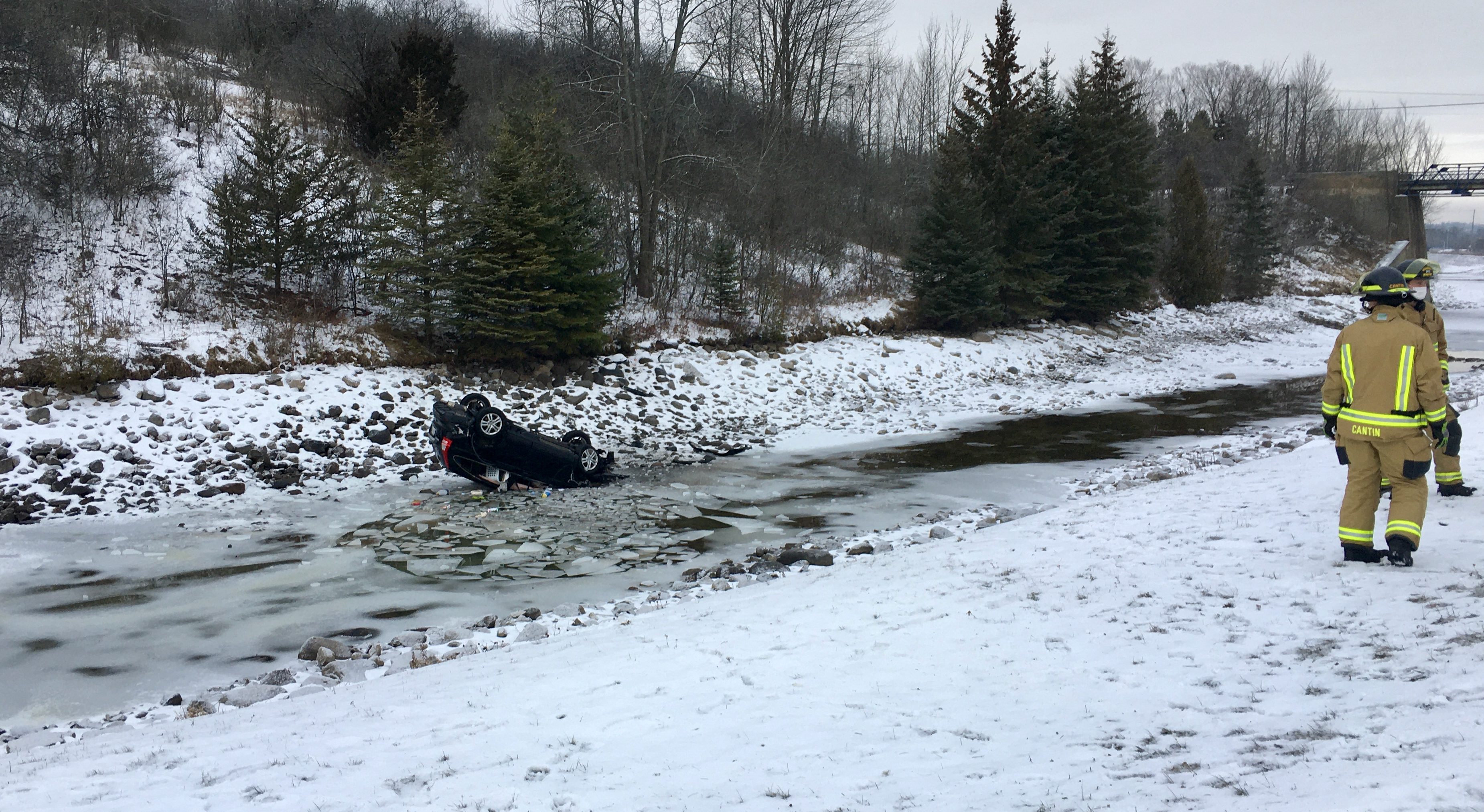 Around 8:30 a.m., just north of the historic Peterborough Lift Lock and near the Old Norwood Road bridge, emergency crews found a car on its roof.