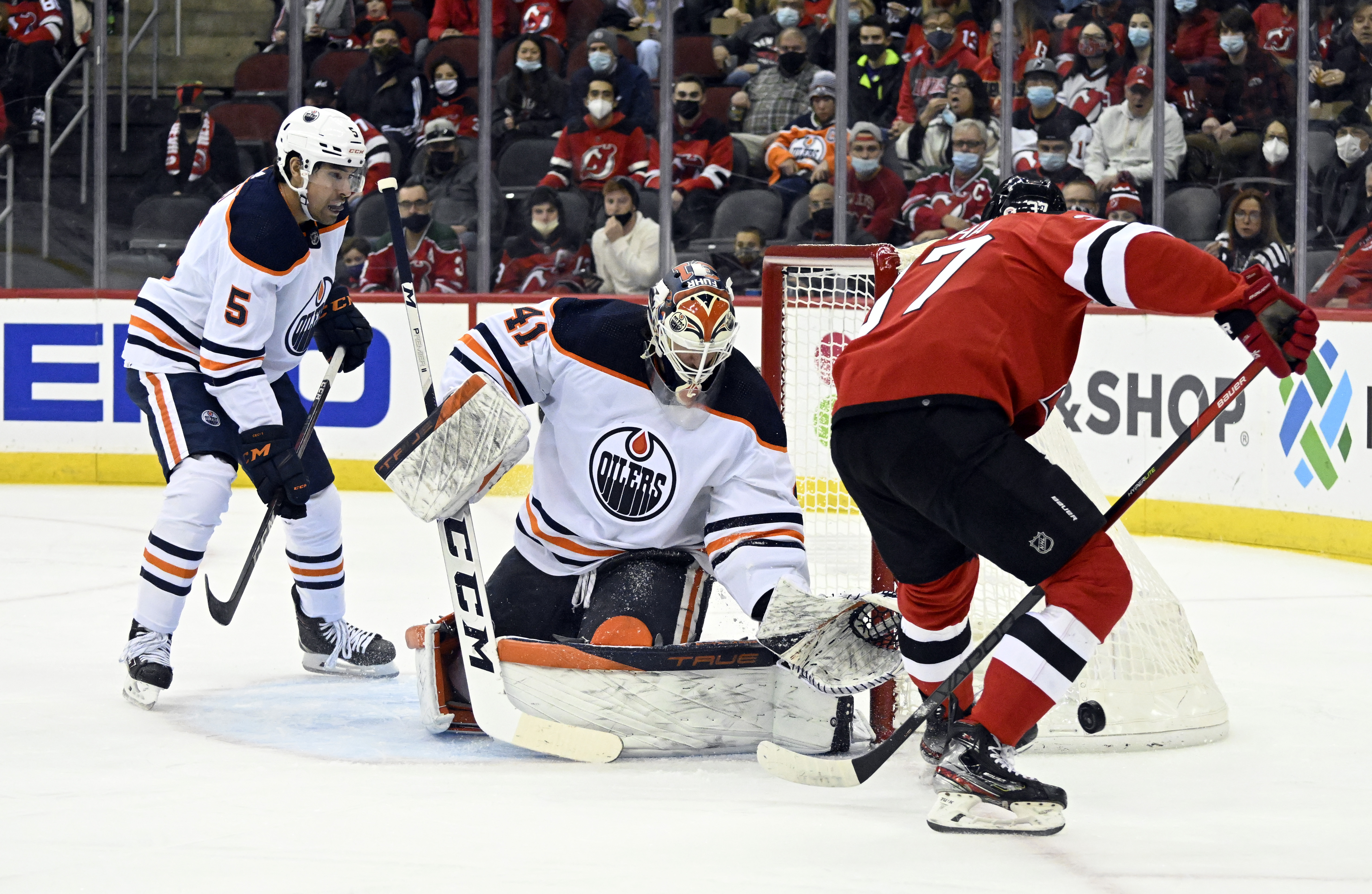 At the six-minute mark of the first, Kailer Yamamoto deflected a Slater Koekkoek point shot for his sixth of the season. Dawson Mercer flipped a shot past Mike Smith to give the Devils a 3-2 edge with 8:50 left in the first.