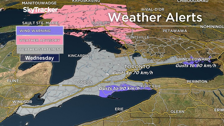 “Southwest winds will pick up ahead of a cold front that will be moving through southern Ontario on Wednesday, intensifying throughout the afternoon and peaking by evening,” Global News weather specialist Ross Hull said.