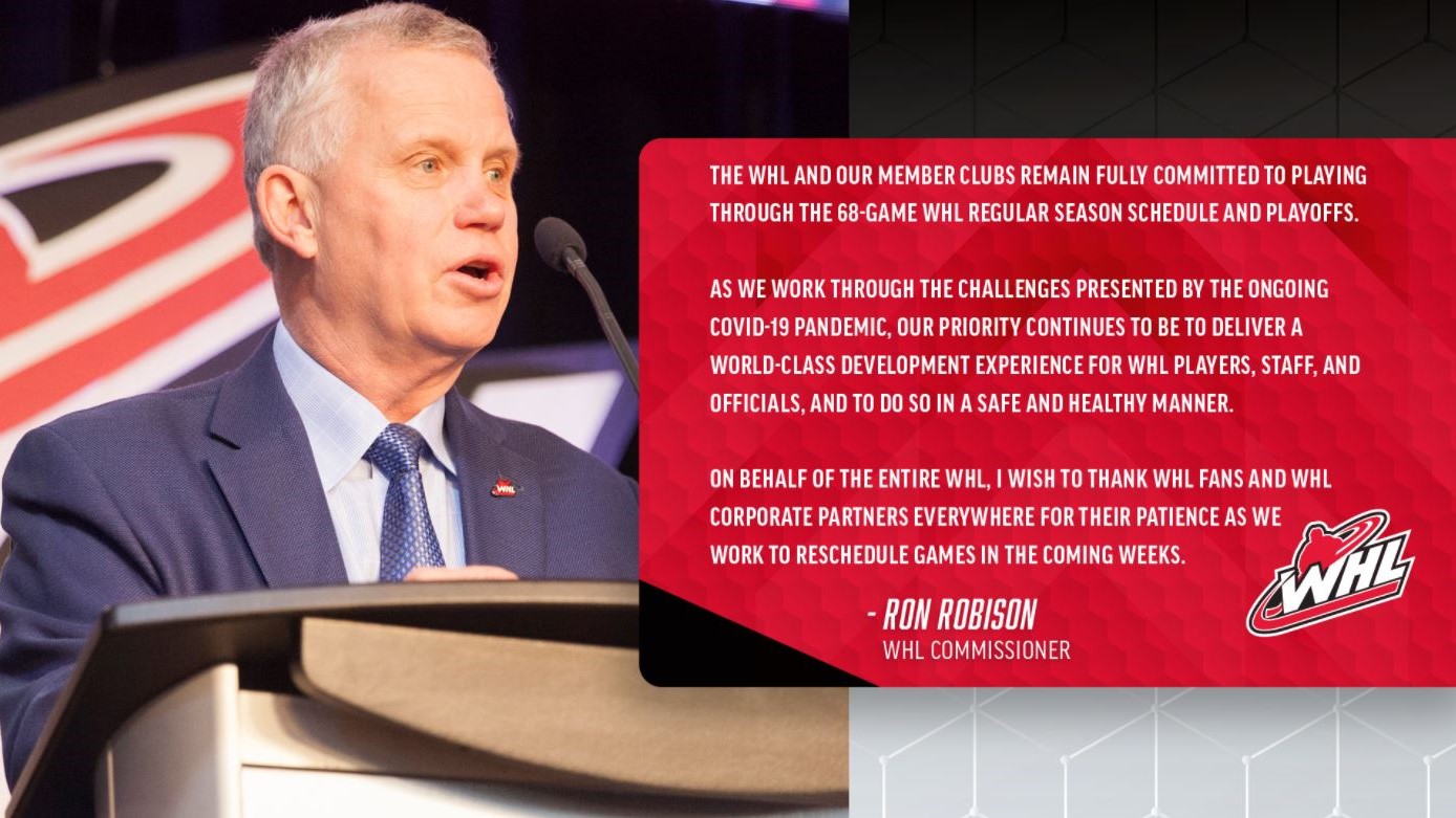 “The WHL and our member clubs remain fully committed to playing through the 68-game WHL regular season schedule and playoffs,” said league commissioner Ron Robison.