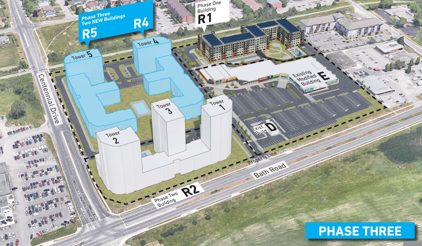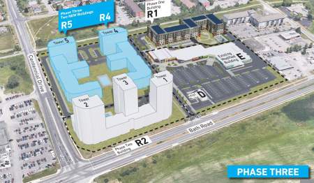 The second phase includes three 20-storey high-rises connected by a six-floor podium near the corner of Centennial Drive and Bath Road with 671 apartment units.