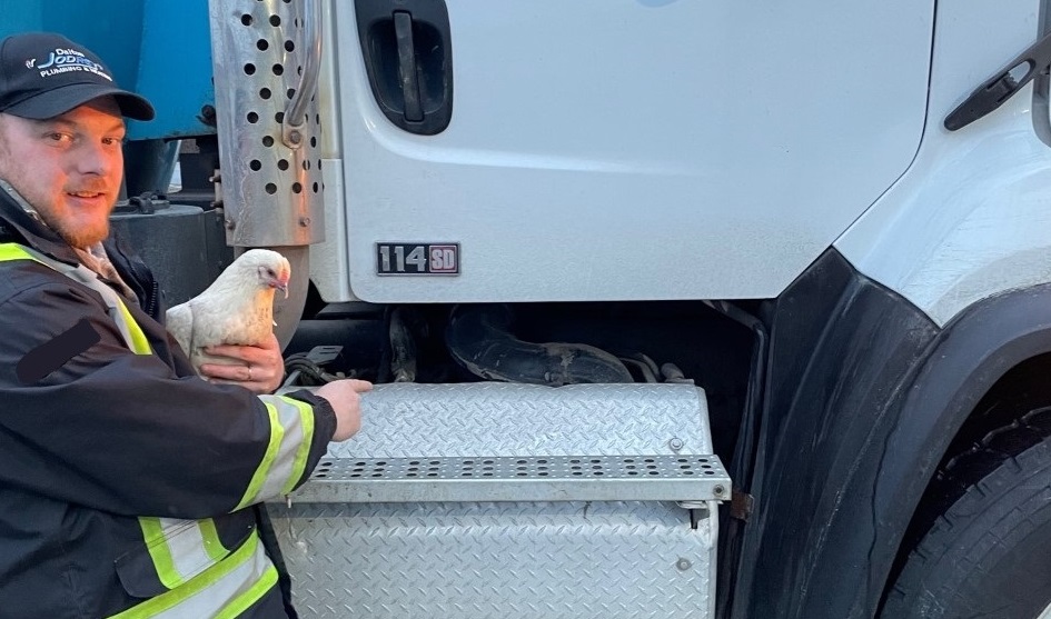 Little did he know that the freedom-seeking fowl had managed to sneak back on the truck.