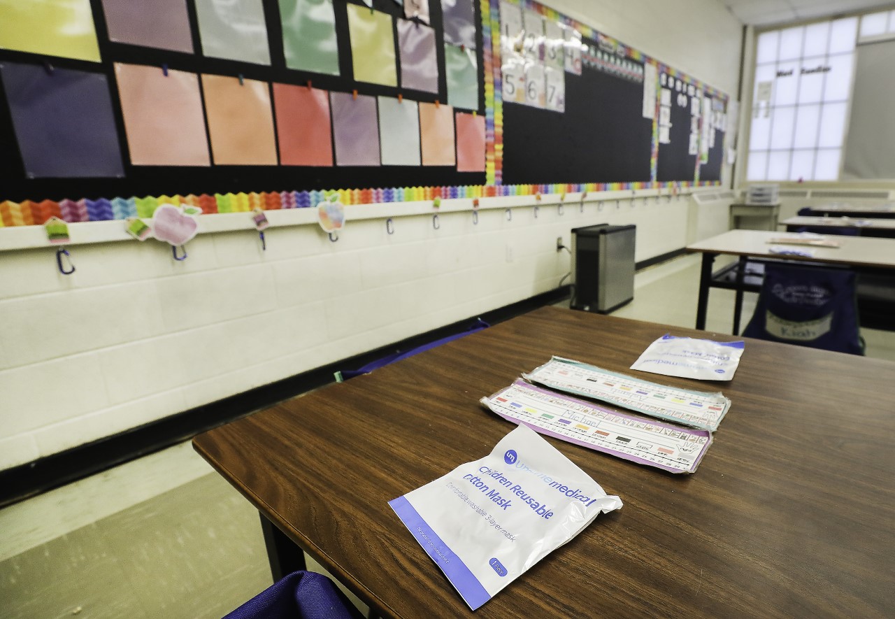 The province released photos of the classroom preparations, which included masks on desks and filtration systems plugged in.