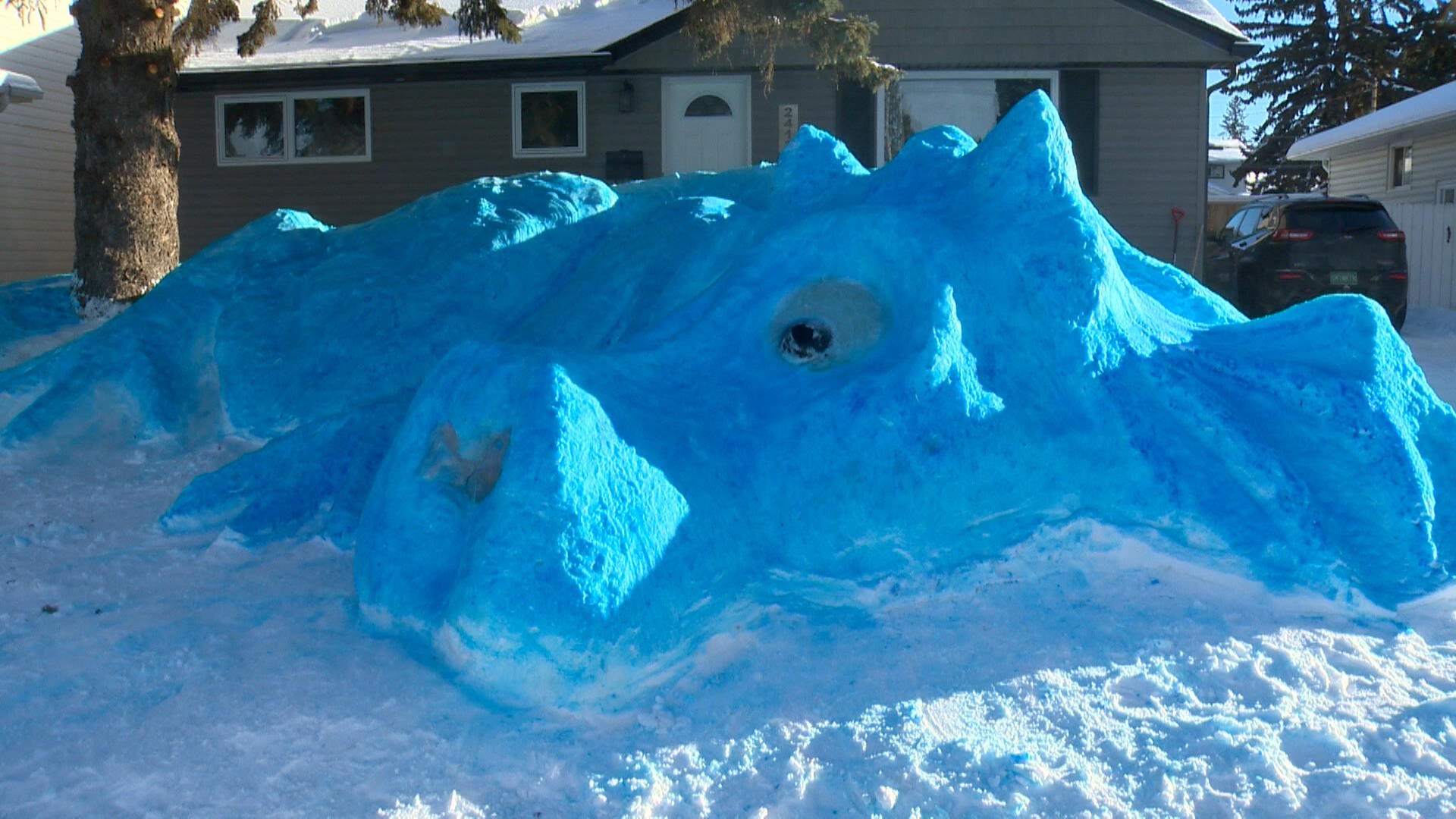“I actually brought two dump trucks full of snow and took some snow from the backyard (and) neighbour’s yards to make him,” said Thompson. “We just haven’t had enough snow so far this year. He breathes fire and his nose smokes this year at night.”