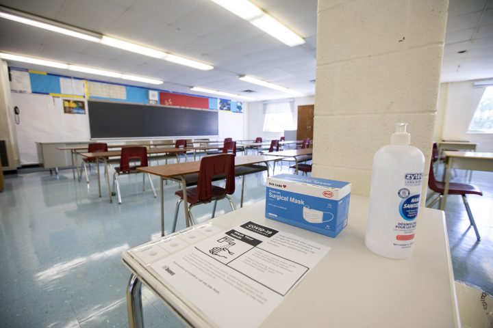 A physically distanced classroom with masks and hand sanitizer is seen at Kensington Community School on Tuesday, September 1, 2020. Carlos Osorio, THE CANADIAN PRESS