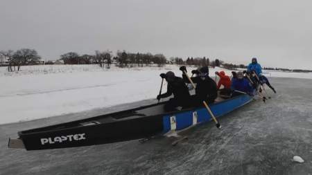 “The biggest (difference) is, well, you can’t use a normal paddle. We have to use a specific type of paddle that has spikes on the end so we can basically spike the ice and pull ourselves forward,” Skirzyk says.