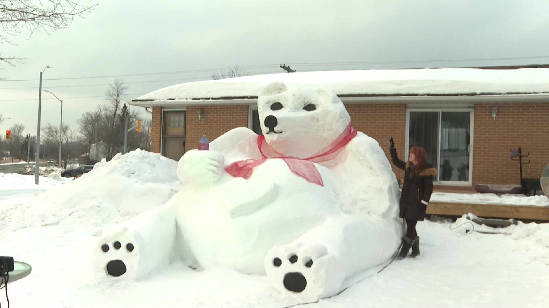 Local resident Rob Lanteigne spent three days building a giant valentine’s “snow bear” in his backyard.