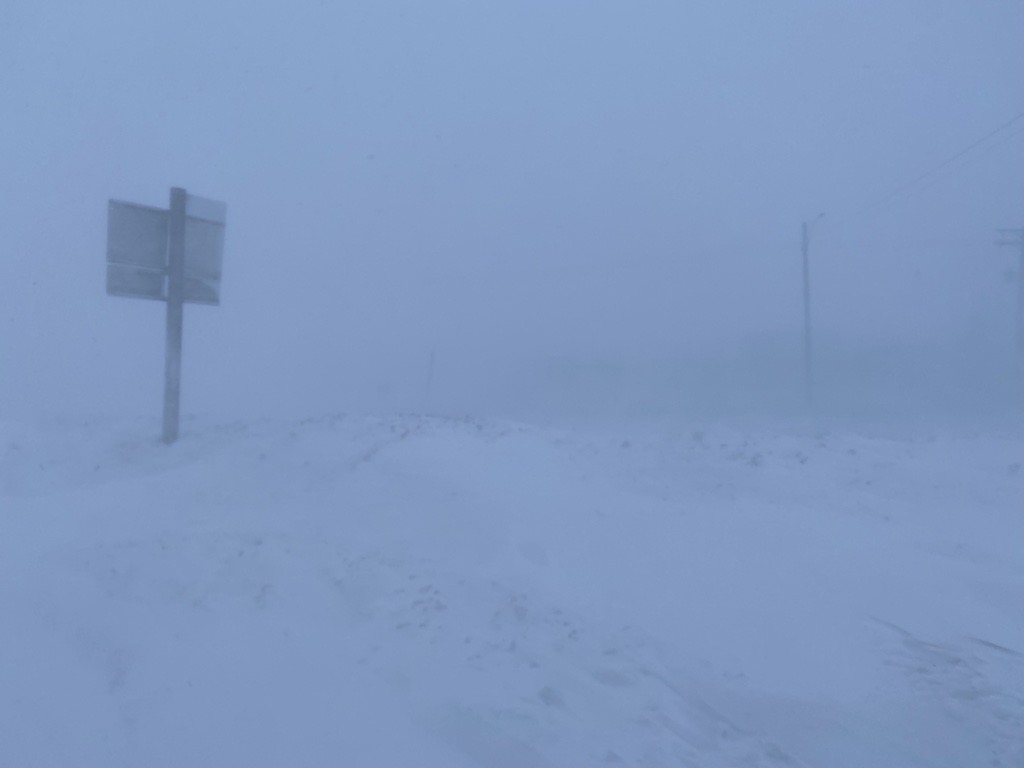 The falling snow and strong winds have combined to reduce visibilities to near-zero.