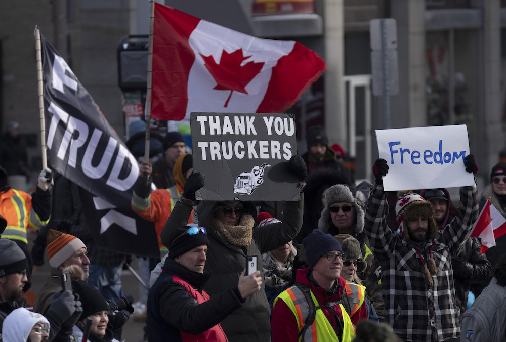 The convoy of protesters has set up camp in Ottawa’s downtown core since Friday, blaring their truck horns and snarling traffic in the area. Police report the crowd’s numbers have lessened since the weekend, but many Centretown streets remain full of honking rigs.