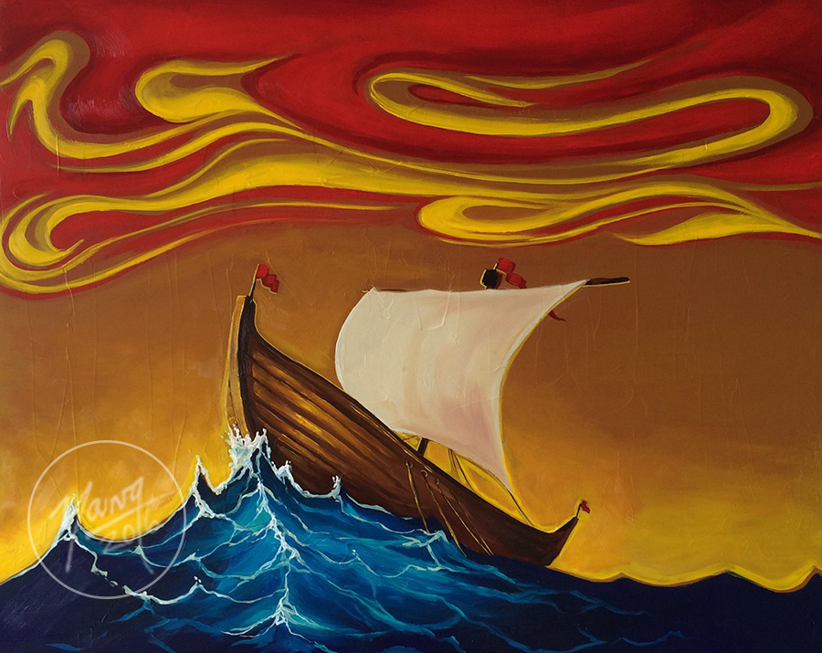 The painting, Roaring Tides, was inspired by the New Brunswick provincial flag and is a part of a series Young did on all four Atlantic provinces.