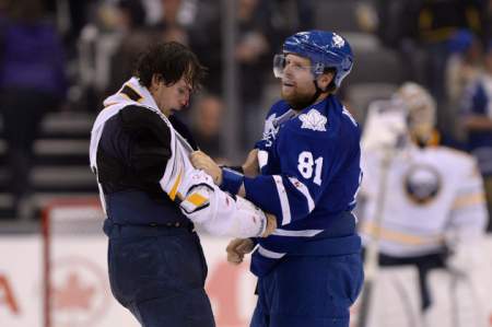 Pure mayhem ensued after the faceoff. Kessel bought himself enough time to evade Scott by swinging his stick like he was on the 18th hole of Augusta, while his teammates jumped Scott. David Clarkson left the bench, earning himself a 10-game suspension, and Nazem Kadri narrowly avoided making the same mistake. Kessel fought, and bloodied, Brian Flynn. And just as things were settling down, Jonathan Bernier channeled his inner Patrick Roy and met Ryan Miller with a hail of punches.