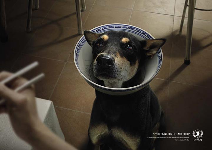 The campaign features images of dogs with large soup bowls around their heads, which look similar to the protective cones veterinarians use after surgery, and a small line of text that reads: “I’m Begging For Life, Not Food.”