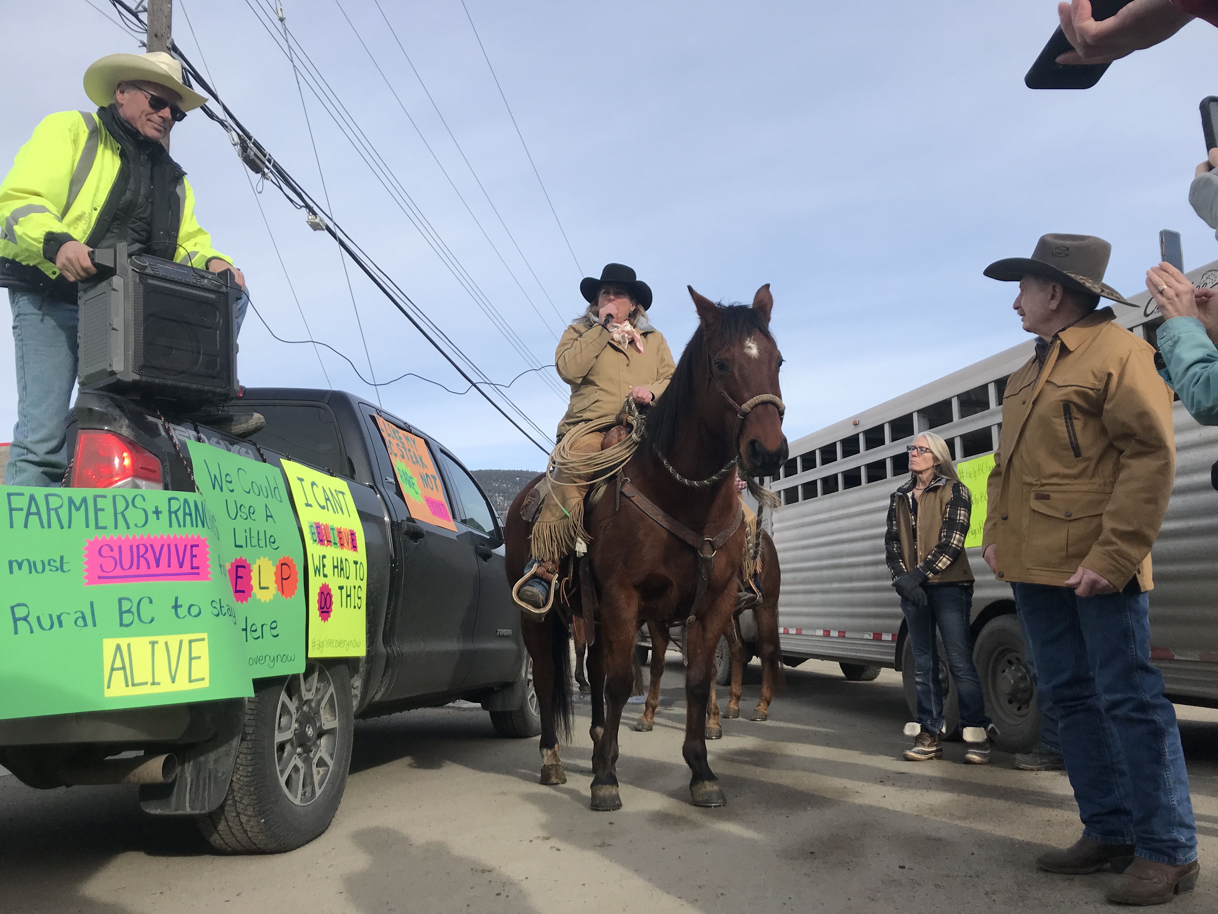 MacDonald and her husband Wayne, who raise beef cattle and grow hay at Bar FX Ranch along Highway 8 between Merritt and Spences Bridge, joined dozens of other ranchers as they rode their horses into Merritt Sunday for a rally in support of the long-anticipated agri-recovery funds.