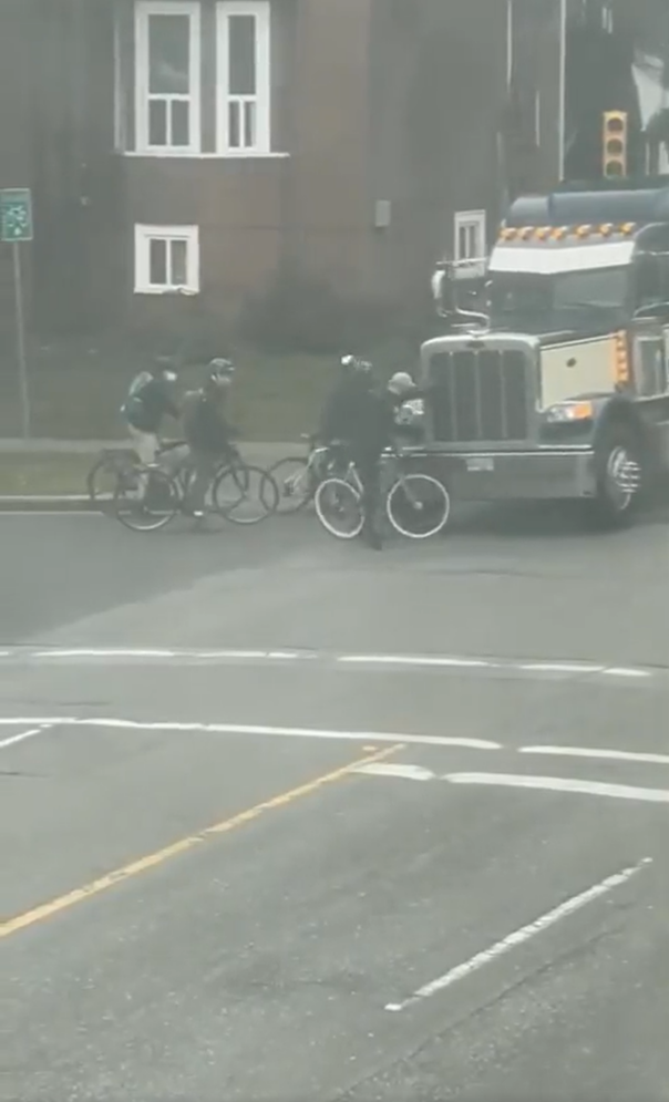 In a video posted to Twitter, which has been viewed more than 88,000 times, the truck driver appears to roll past a counter-protester on a bicycle who tried to block his path. The cyclist moves out of the way but appears to be brushed by the truck in the process.