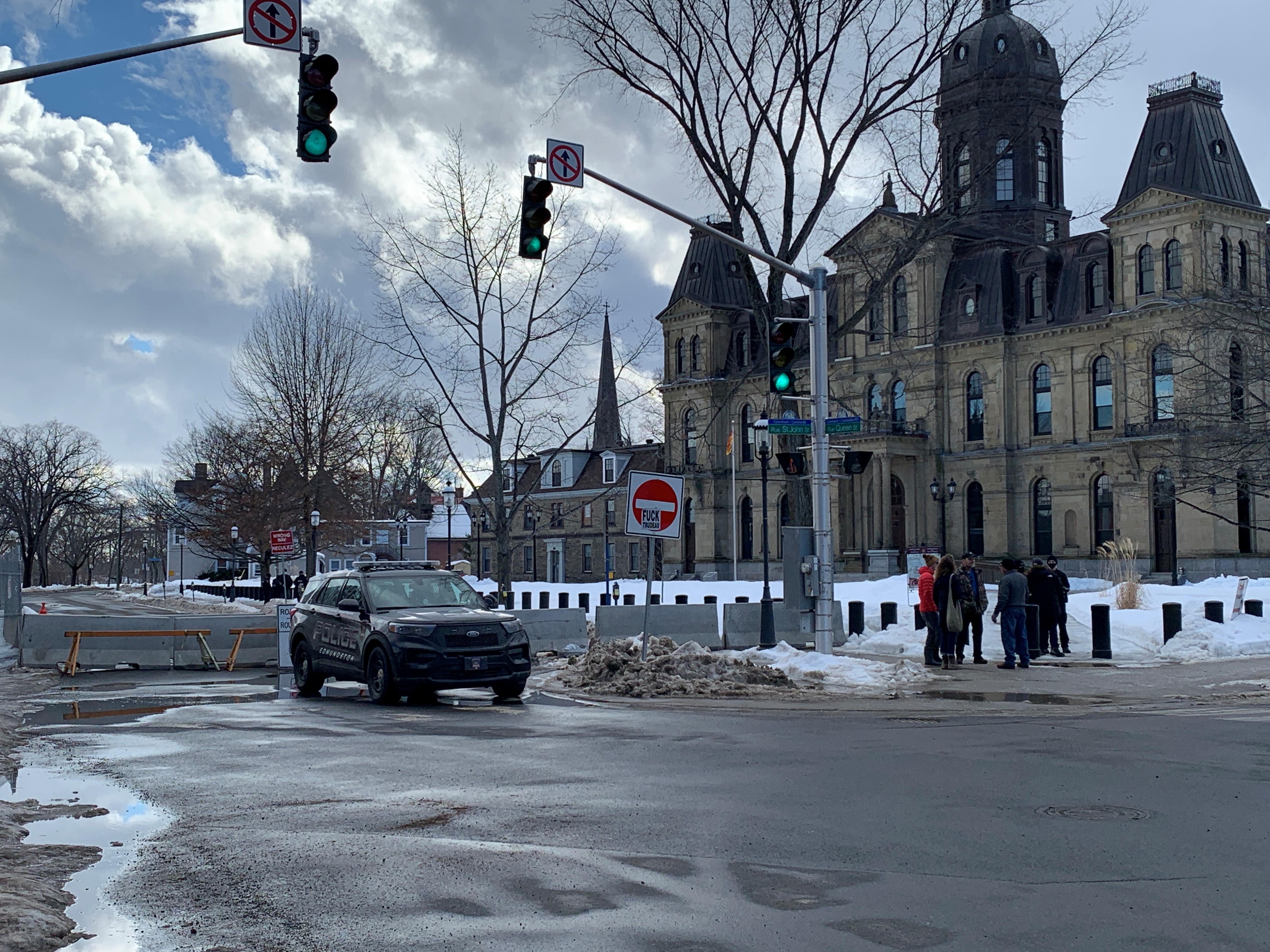 Police in Fredericton barricaded a street in front of the provincial legislature Thursday night, and schools in the downtown closed in anticipation of the protest.