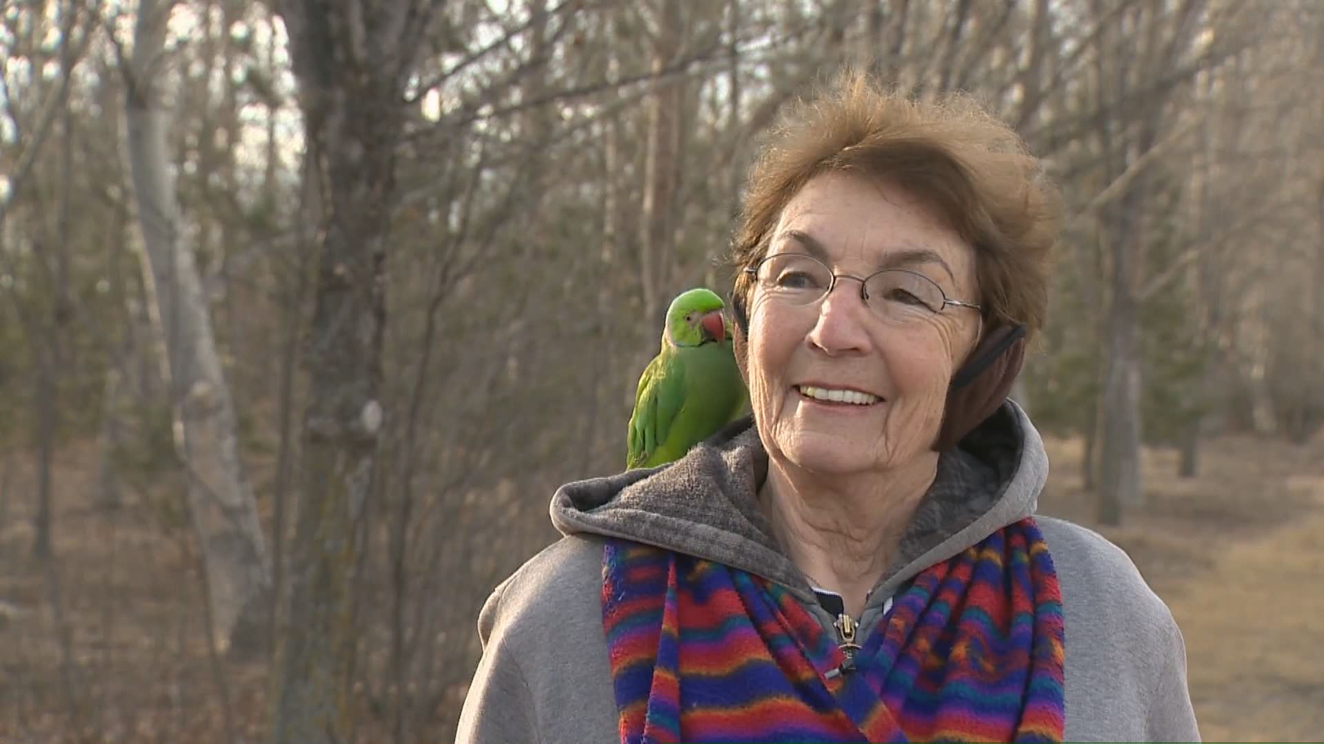 Almost every day, perched over her shoulder, a parakeet joins her on her walks along with her husband and dog.