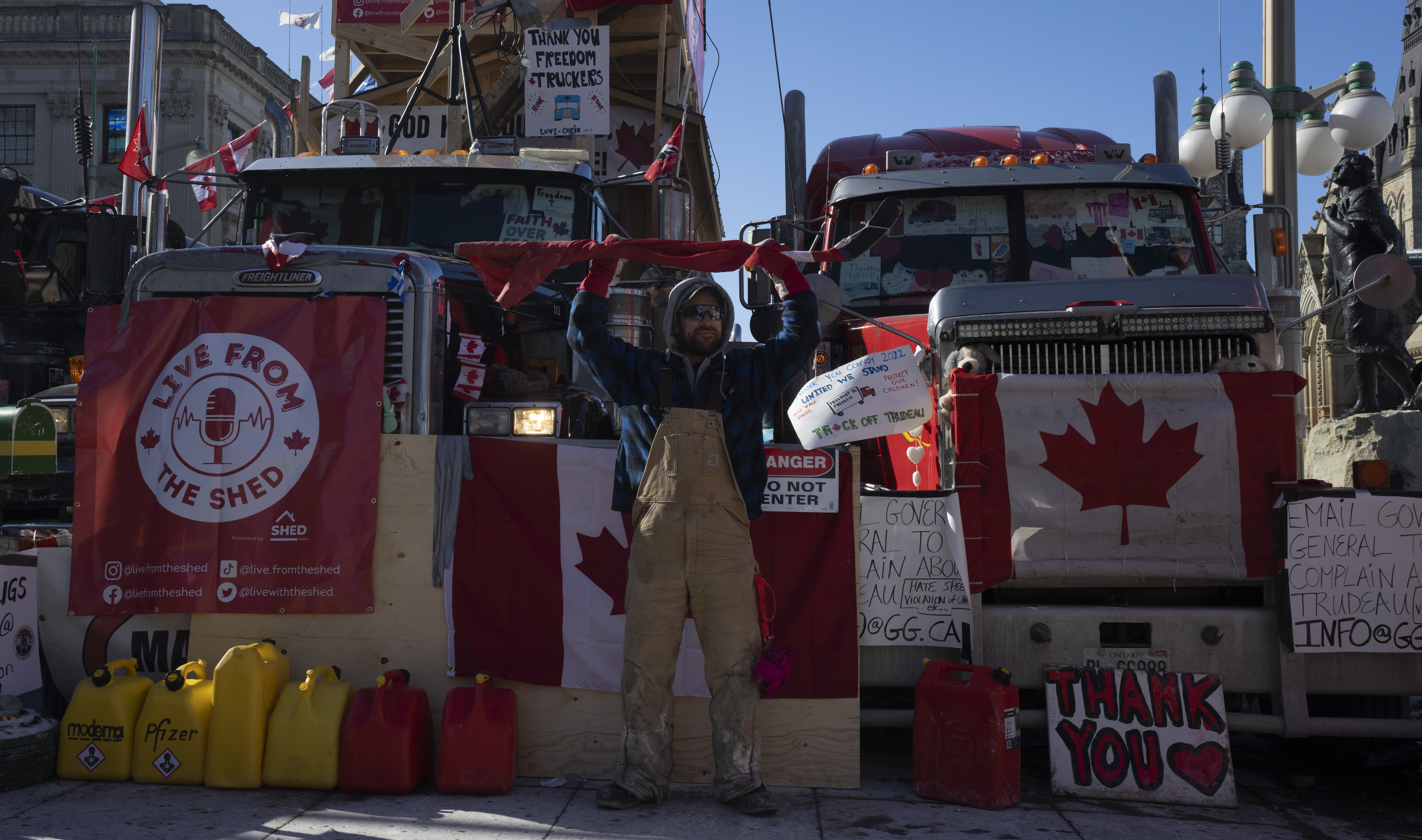 Trucks, RVs and other vehicles with Canadian flags or banners with the word “freedom” in giant letters along their front grilles remain on Wellington Street in front of Parliament Hill, with drivers saying they will stay put until all COVID-19 vaccine mandates and restrictions are lifted.