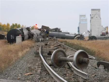 The Saskatchewan government said one of the other derailed cars contains ethanol and was on its side, but was not leaking.