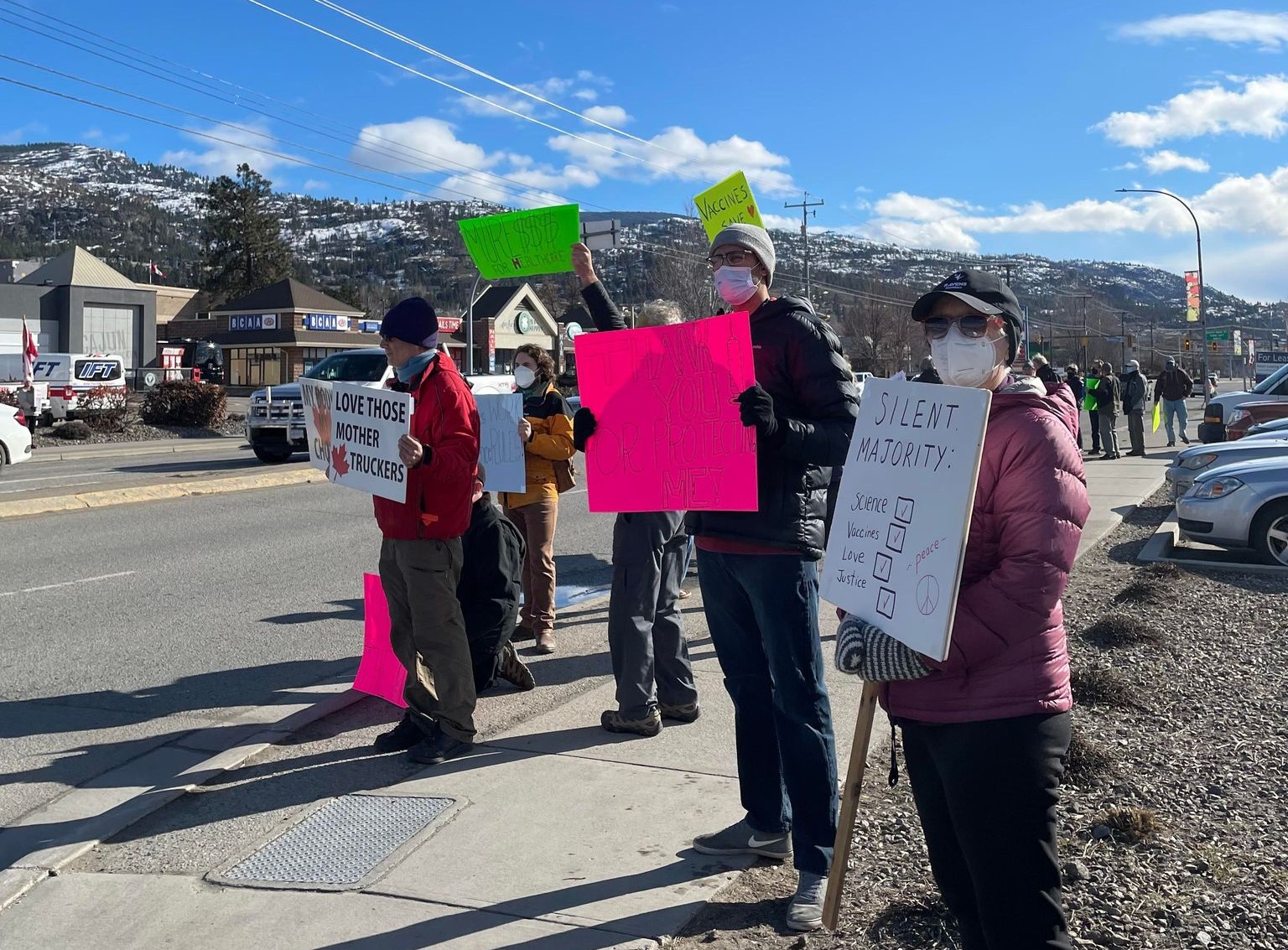 When a large group of people gathered on Main Street in Penticton, B.C. for the ongoing protest against COVID-19 mandates, a smaller group of counter protesters gathered across the street.