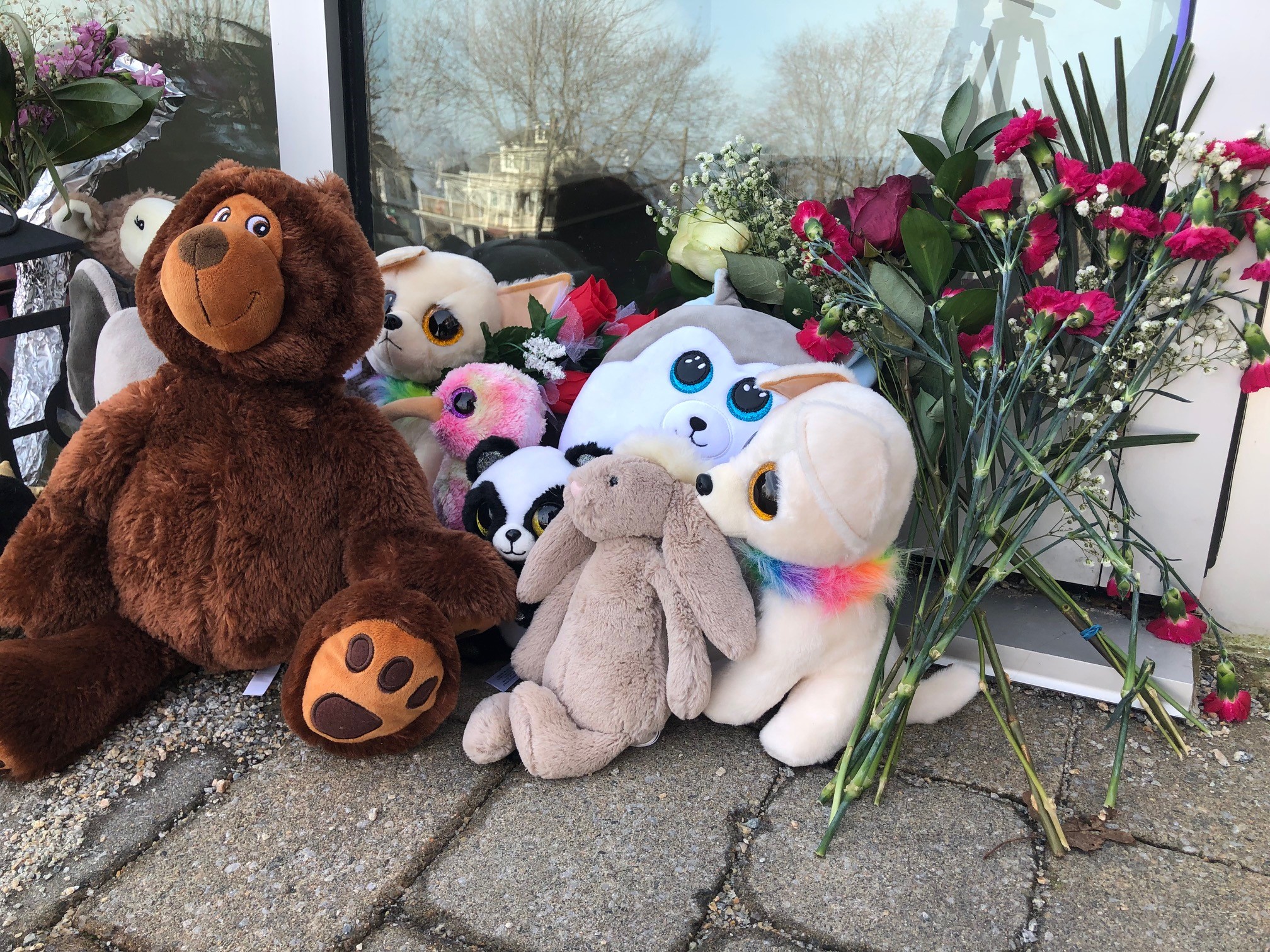 A memorial of flowers and stuffed animals were outside Bluenose Academy on Monday. Flowers have also been left at the site of the fire.