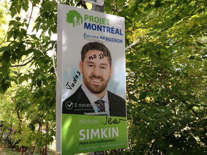 “Old Jew” covers a couple of Simkin’s campaign posters in NDG.